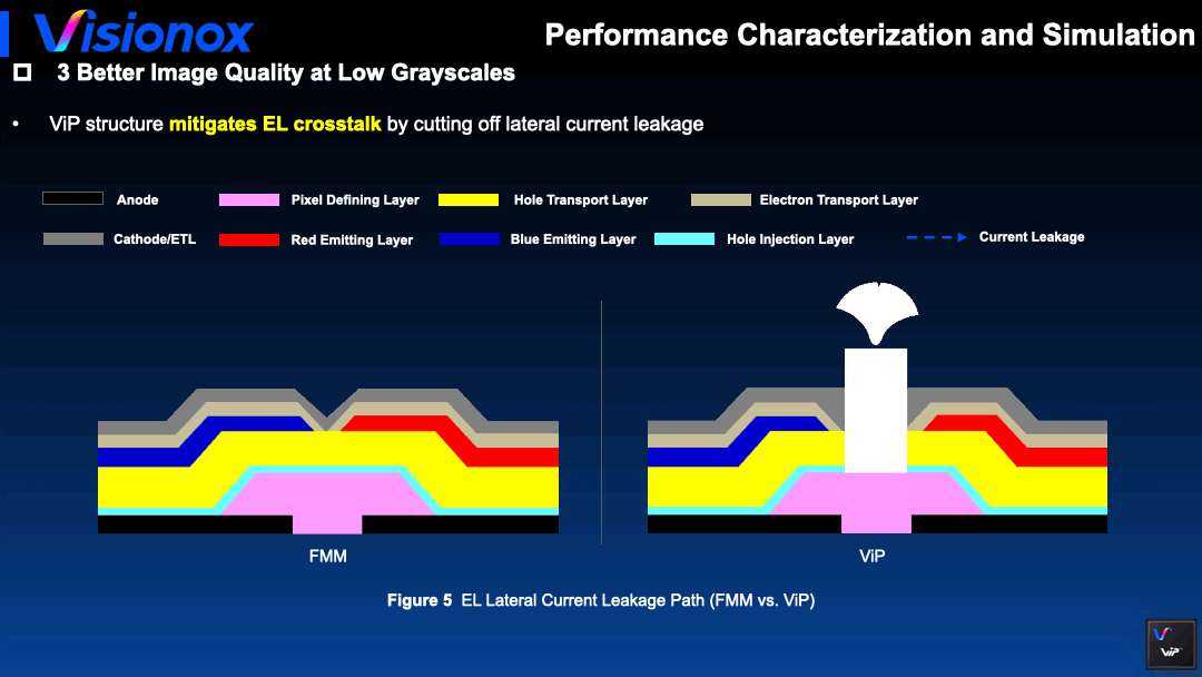 For sub-pixels with each color, all EL films, cathodes, and CVD packaging layers closest to the device can be fully customized according to the characteristics of RGB color, to enhance microcavity gain. This allows for a better balance between EL device efficiency and brightness decay. ViP AMOLED can achieve a JNCD of less than 1.0 at an angle of view of less than 75°; compared with FMM AMOLED, the EL device can achieve a 6.5% reduction in power consumption (it is derived from computer simulations).